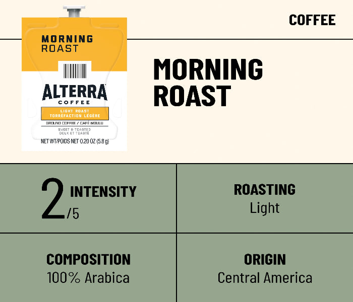 Alterra® Morning Roast is a sweet and toasted Arabica light roast. Made for your Flavia® Brewer, this Freshpack produces drip coffee.