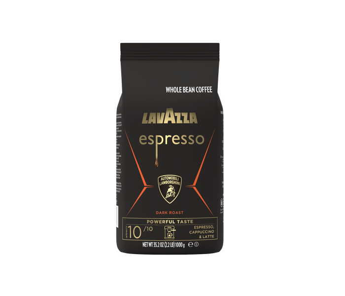 LAVAZZA ESPRESSO FOR AUTOMOBILI LAMBORGHINI: A 2.2 lb whole bean coffee bag ideal for espresso preparation.