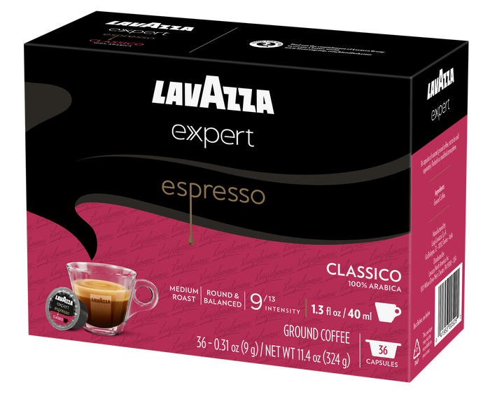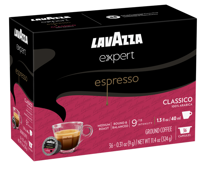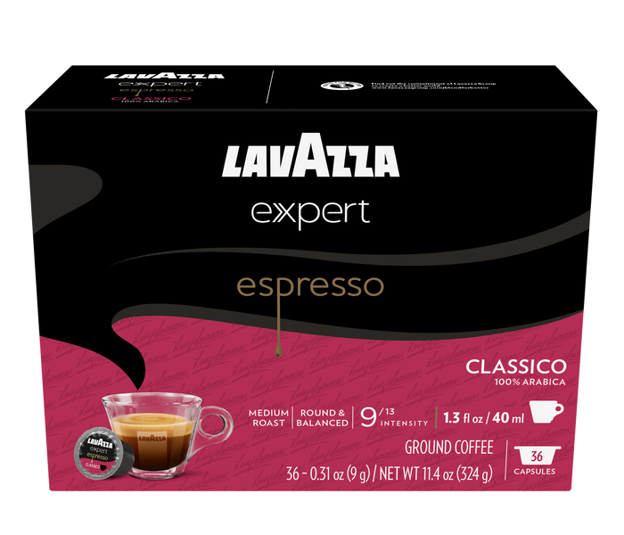 Redefine your coffee ritual with Lavazza Expert Capsules. Espresso Classico is a round and balanced blend, with aromatic notes of nuts, cereals, and chocolate. This 100% Arabica blend comes from Central and South America. Compatible with Lavazza's Classy Mini Espresso Machine and Classy Plus Espresso and Coffee Machine - conveniently craft lattes, cappuccinos, espresso, drip coffee and more with the touch of a button!