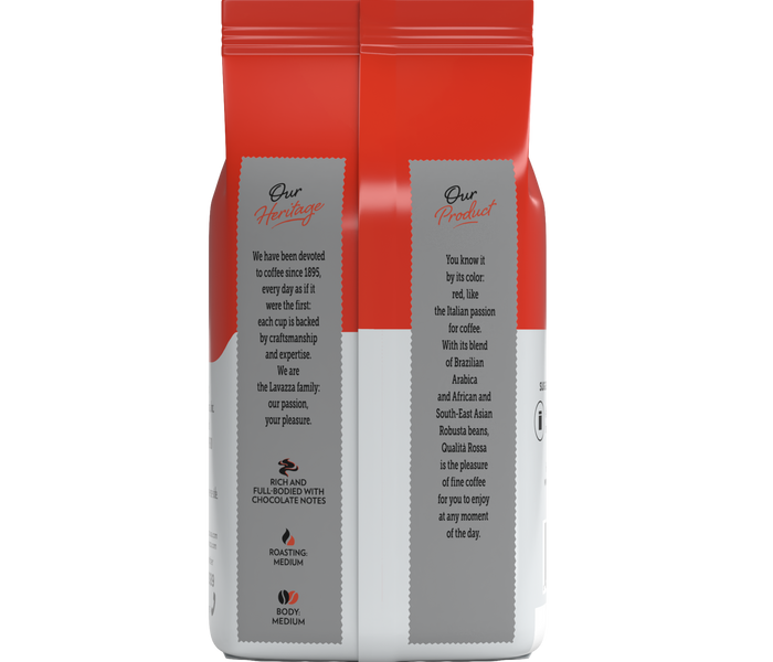 Qualità Rossa is a velvety medium roast featuring chocolate aromatic notes. This Arabica and Robusta blend is sourced from South America, Africa, and Southeast Asia. This blend is ideal for espresso or drip coffee preparation.